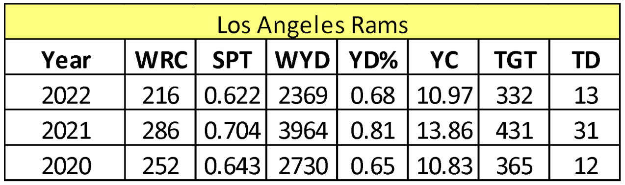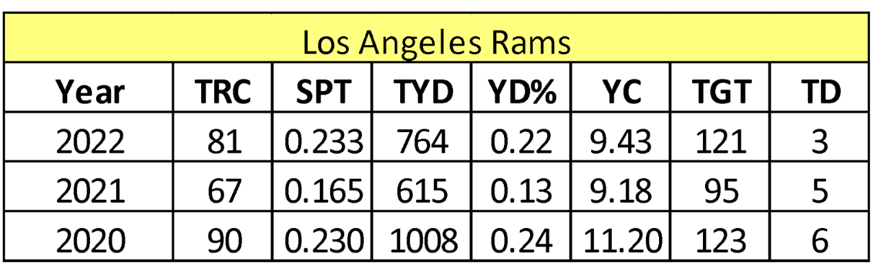 Los Angeles turned back to the tight end position last year, leading to a gain of 14 catches for 149 yards and 26 targets more than in 2021. They gained short yards per catch (9.4) for the second consecutive season, with Matthew Stafford behind center.