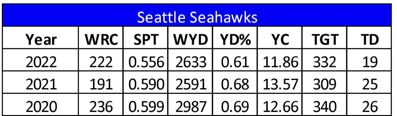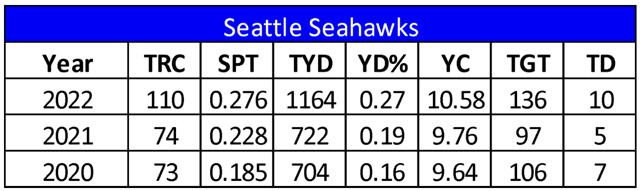 Despite respectable stats at wide receiver in 2022, the Seahawks set a three-year low in yards per catch (11.9) and touchdowns (19) while gaining 61% of the team’s receiving yards. Seattle gave their wideouts more than 300 targets in each of the past three seasons with a floor of 2,500 receiving yards.