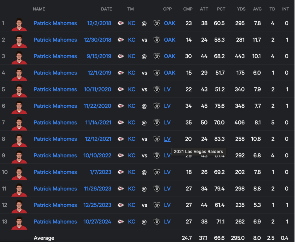 Additionally, Mahomes has a favorable matchup against a Raiders secondary that he already threw for 268 yards against back in a Week 8 victory for the defending champs. Despite all the injuries to some key skill-position players, Travis Kelce and Noah Gray appear to be the top one-two punch at the tight end position in the NFL and the arrival of veteran DeAndre Hopkins has definitely helped this offense. Despite some inconsistency from the wide receiver corps, Mahomes continues to distribute the ball effectively, targeting Travis Kelce and utilizing backs in the passing game. His efficiency on throws over 20 yards is among the league’s best, ensuring his ability to rack up yards quickly. In 13 games against the Raiders over his career, he has 238+ passing yards 10 times. I’ll take those odds any day of the week.