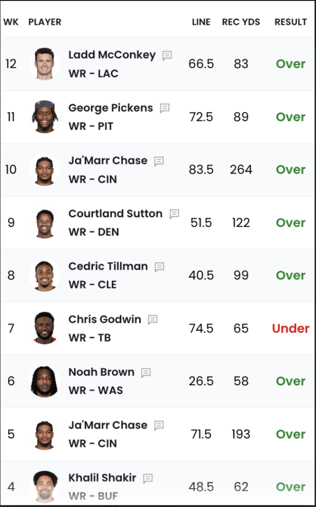 Baltimore’s defense has become a pass-funnel unit, allowing the most receptions (305) and receiving yards (3,569) in the NFL this season. Opposing WR1s have consistently feasted on this secondary, surpassing their receiving yardage props in five straight games. Notable performances include: