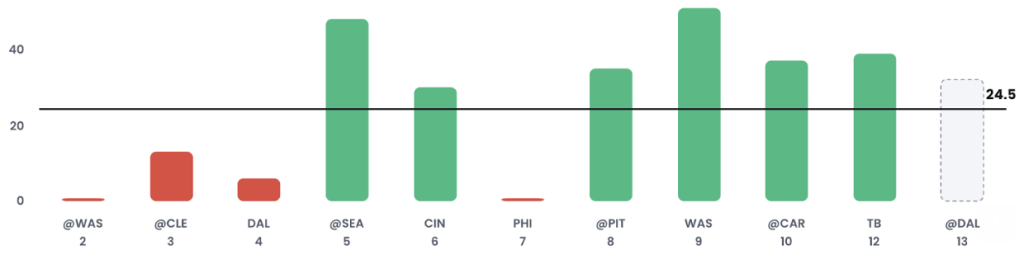 Consistent passing volume has helped Carr as the Saints are typically playing from behind. Carr has surpassed this line in 8 of his last 10 games. This consistency underscores his role in the Saints offense, which leans heavily on his arm, especially in matchups where they face defensive vulnerabilities in the secondary. Which leads me to my next point.