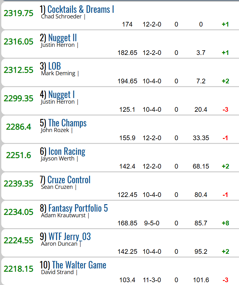#6 Icon Racing (Jayson Werth) — MLB superstar Werth shines with a smart Dak-over-Hurts call. J Taylor/ETN, Lamb, Pittman, and Trey McBride, with Diggs and Kittle benched. Could he do the unthinkable and cross over from legendary baseball status to fantasy football phenom?